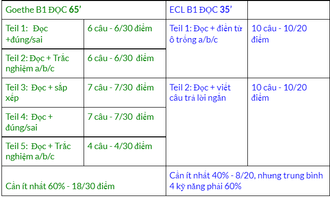 Phần đọc format rất giống phần nghe, Teil 1 trắc nghiệm, Teil 2 viết câu trả lời ngắn. Thời gian thi ECL đọc chỉ bằng một nửa Goethe, nhẹ hơn và đọc tập trung hơn.